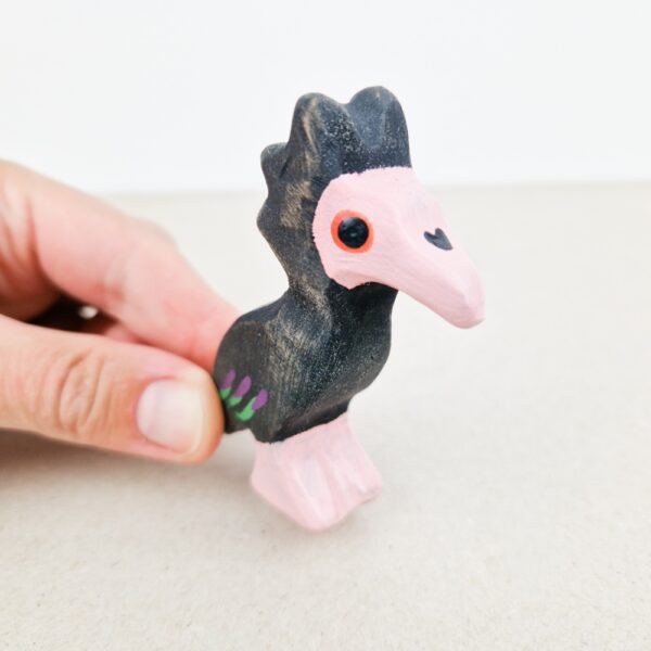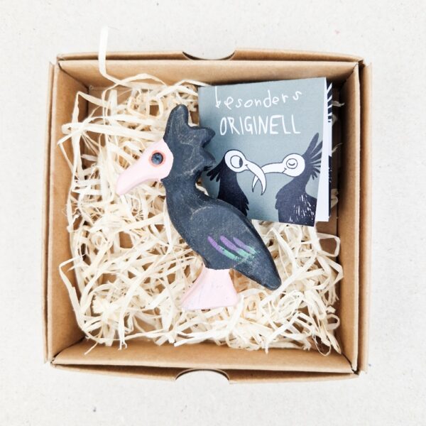 Die Holztiere sind geölt und gewachst und dadurch wasserfest. Man kann sie also einfach mit Wasser und der weichen Seite eines Schwammes reinigen und sogar mit zum baden nehmen. Um die Wachsschicht und die Bemalung nicht zu beschädigen bitte auf kratzige Schwämme und Reinigungsmittel verzichten. Vor dem Verstauen gut trocknen lassen.