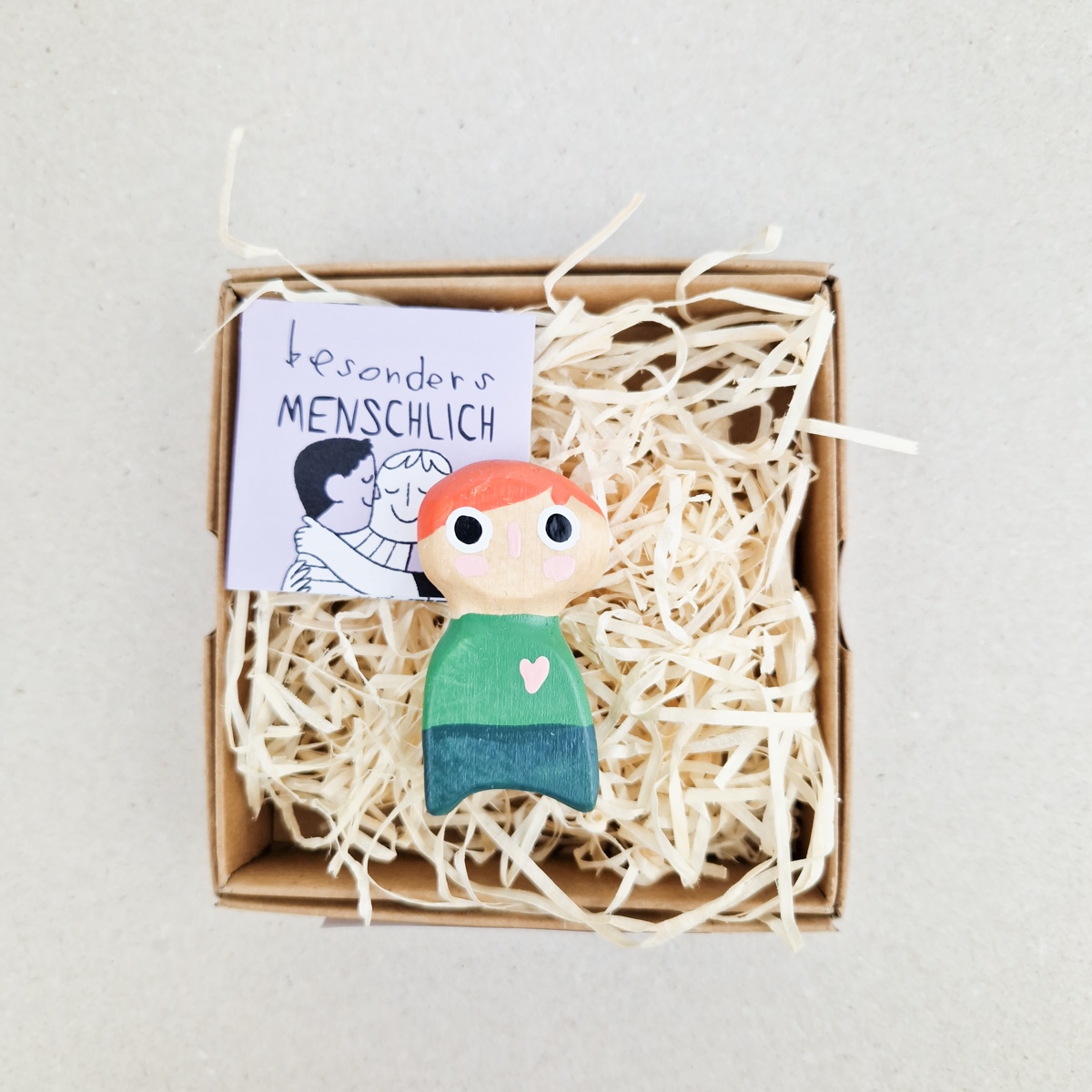 Die rothaarige Menschenfigur aus unserer inklusiven und besonders menschlichen Holzfiguren-Reihe lädt Kinder zu freiem Spielen und fantasievollen Geschichten ein. Durch ihr neutrales Design kann die Figur einfach Mensch sein, ganz ohne vorgegebene Rollenbilder. Mal fröhlich, mal traurig – ganz wie es sich im Spiel ergibt. Die Figuren können auch gestapelt werden und lassen sich toll mit unseren Holztieren kombinieren. Beim Kauf einer Holz-Menschenfigur wird 1€ an den Verein „Rettet das Kind“ gespendet.